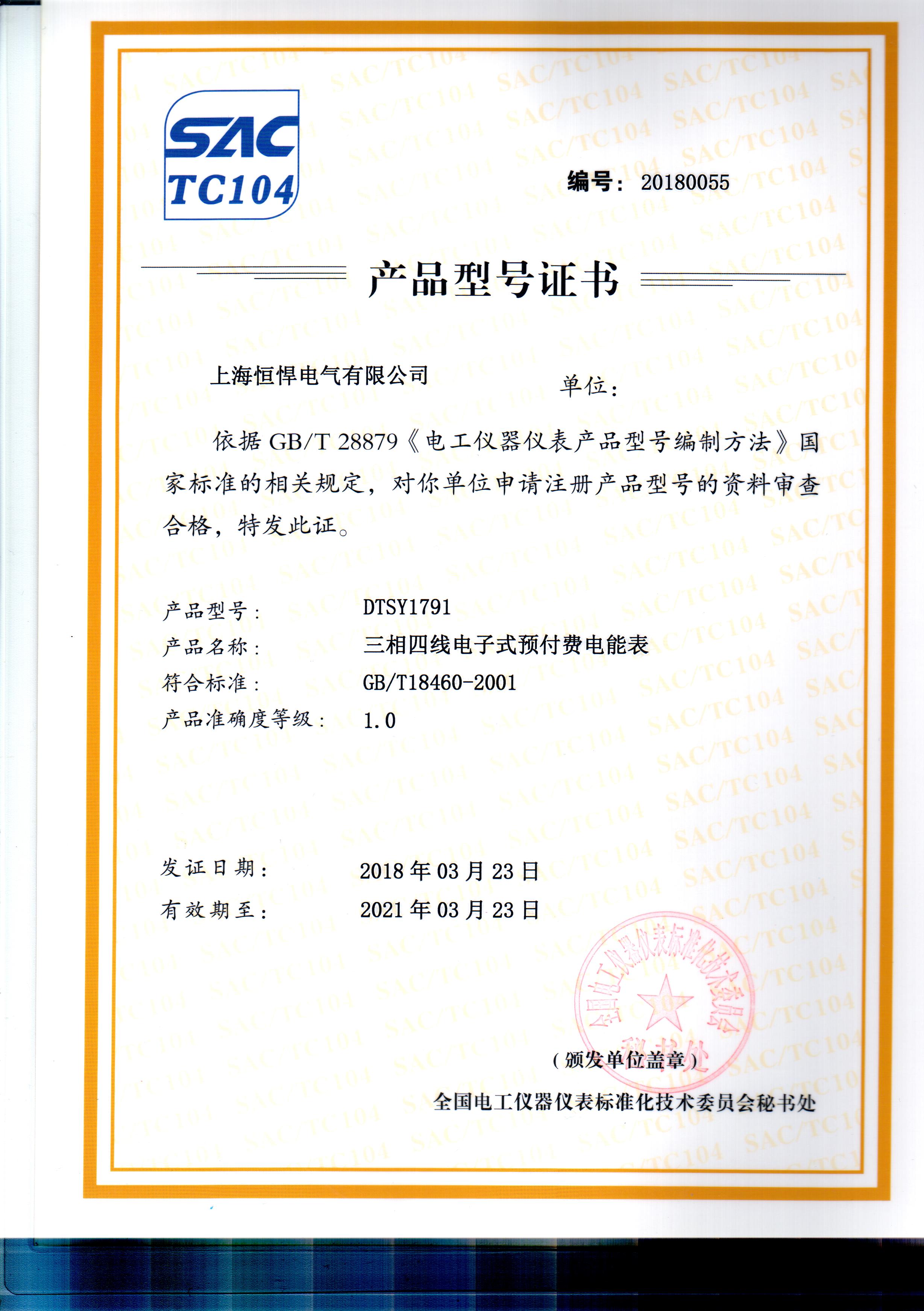• 恒悍三相預付費電表型號證...